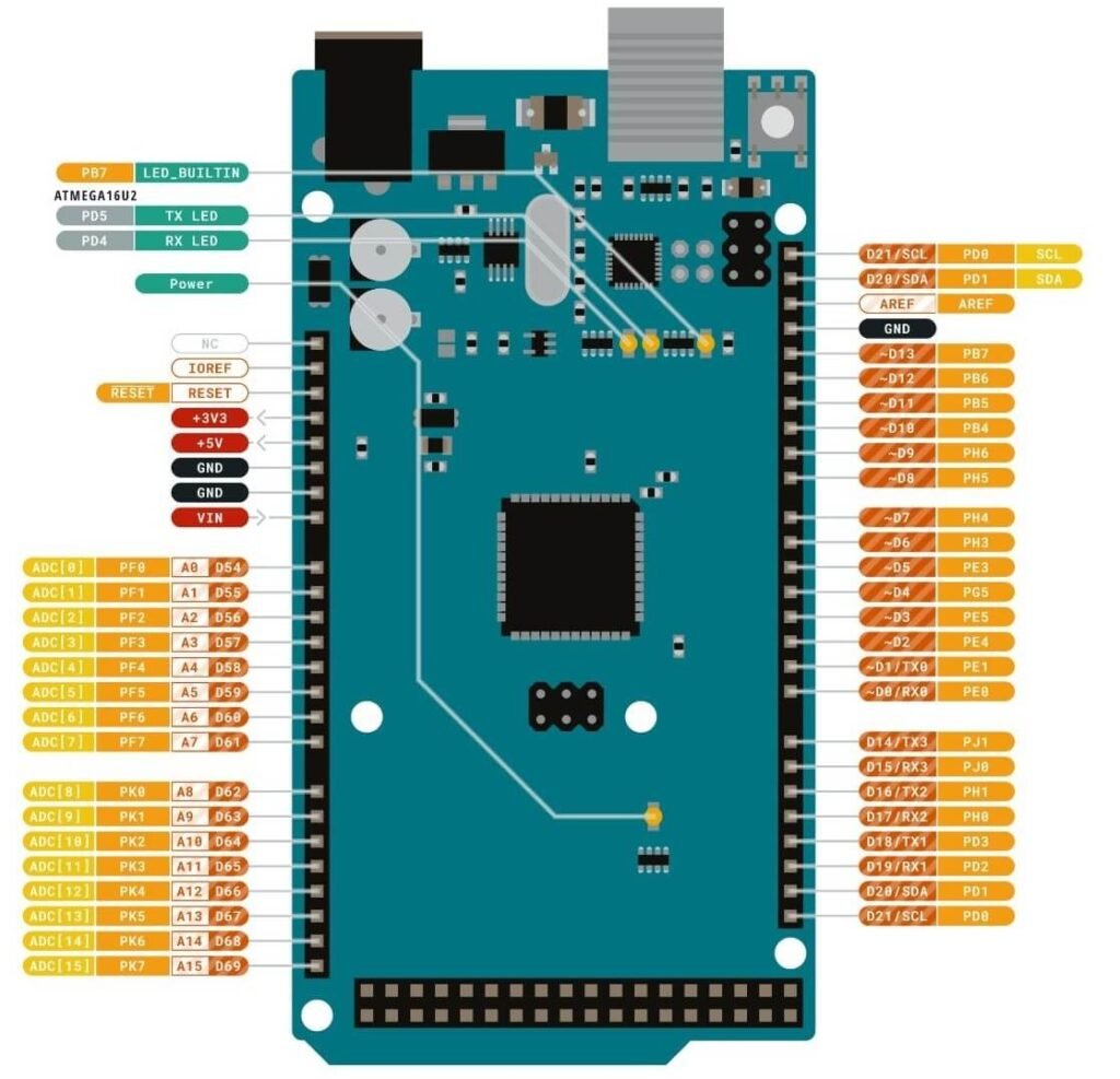 - PWM: D2–D13, D44–D46 (15 pins, 8-bit PWM)