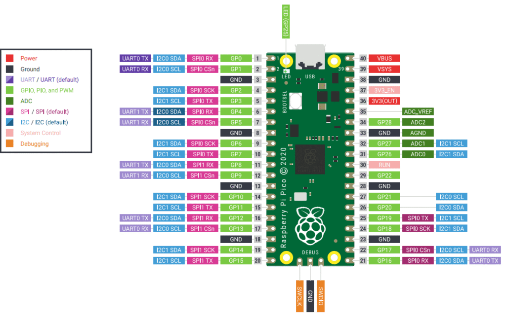 Below is the complete pinout and hardware overview for the Raspberry Pi Pico.
